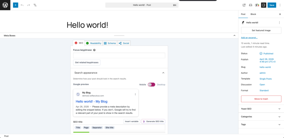 The Yoast SEO panel appears inside the WordPress editor for posts and pages. This is where you set the focus keyphrase, SEO title, slug, meta description, and social preview for each piece of content.